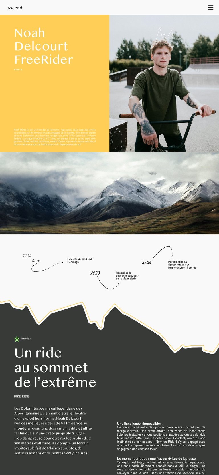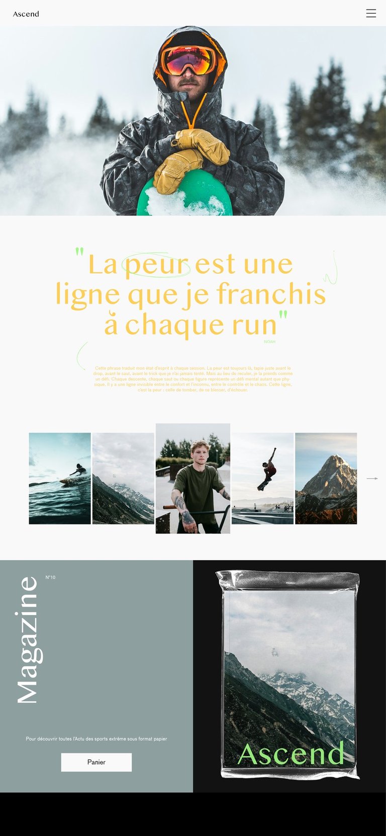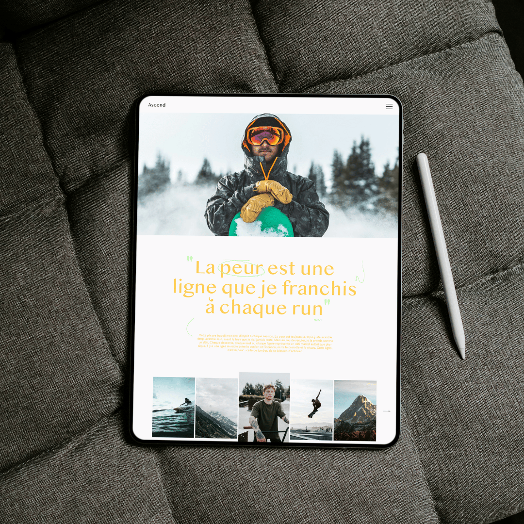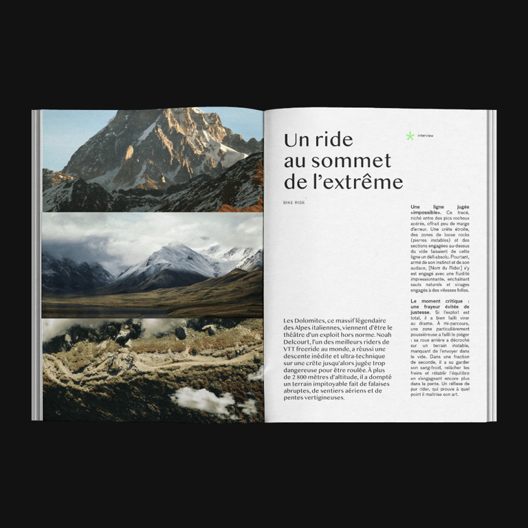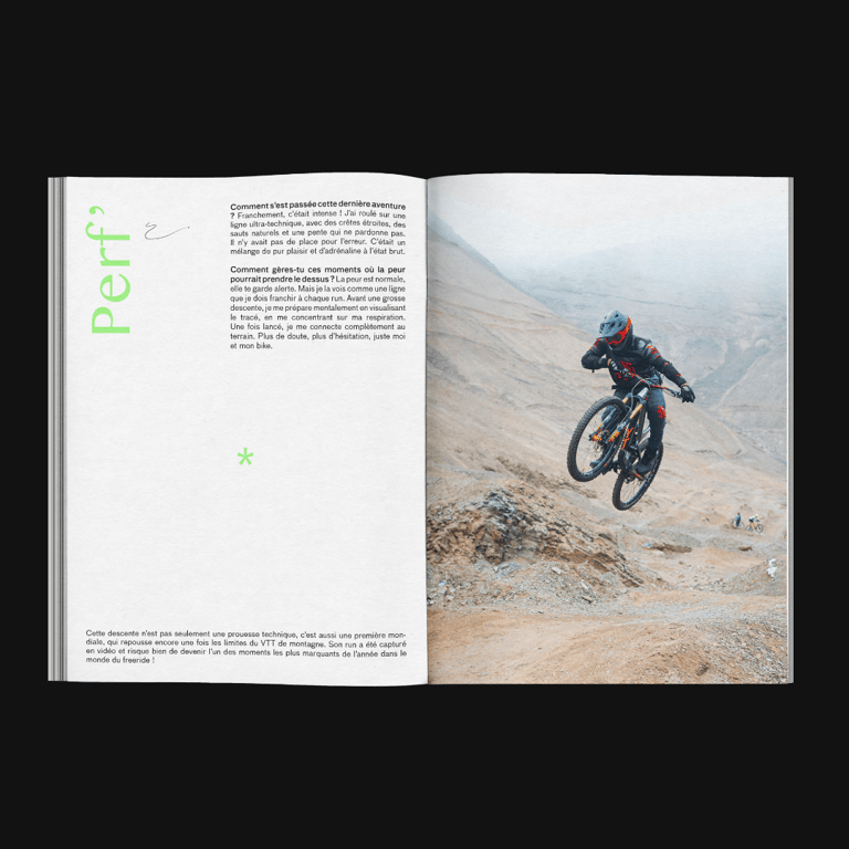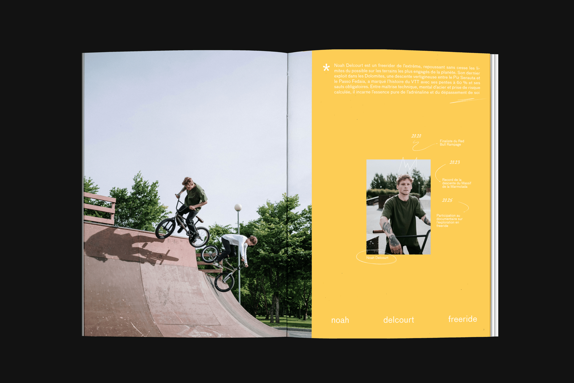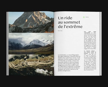 "Ascend" est un magazine semestriel dédié aux sports extrêmes, mettant en lumière les athlètes les plus audacieux et les exploits les plus impressionnants. Chaque numéro célèbre une figure emblématique du monde de l’adrénaline et devient une immersion dans la culture de la performance et du dépassement de soi, où chaque page retranscrit l’intensité, la détermination et la passion de ces sportifs hors normes.