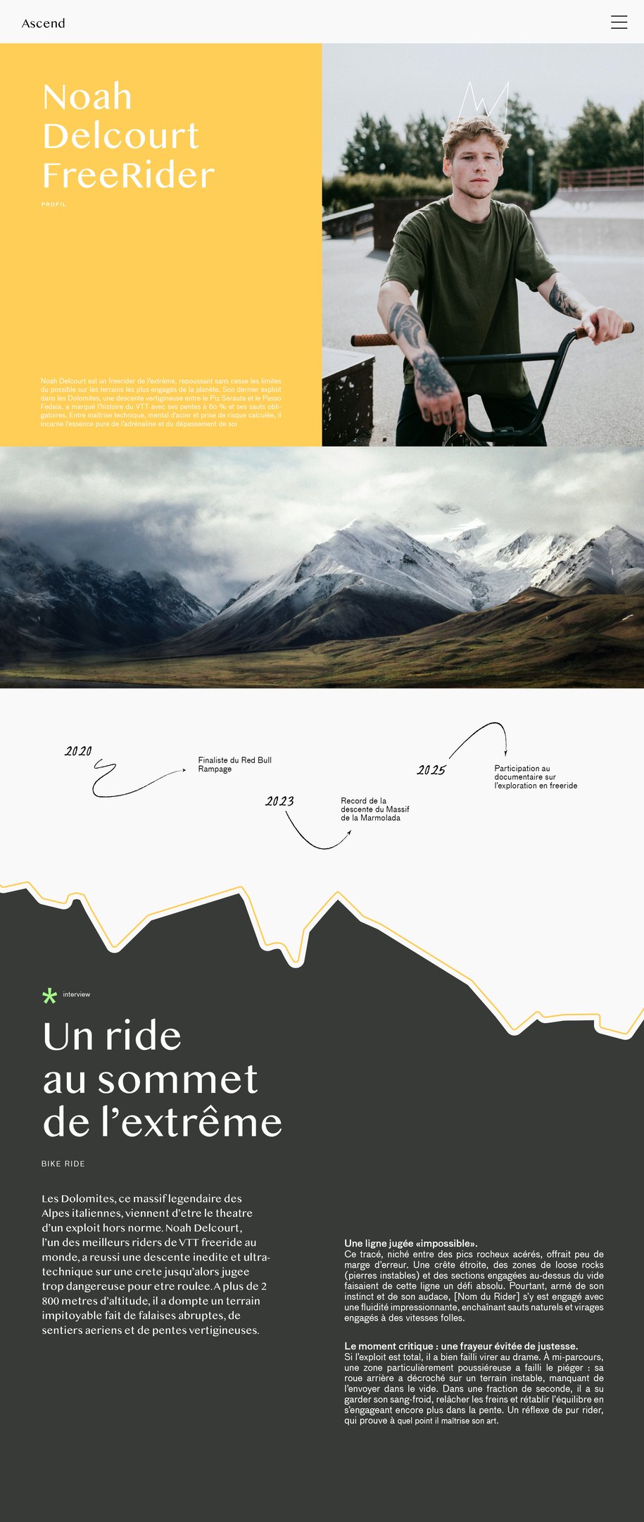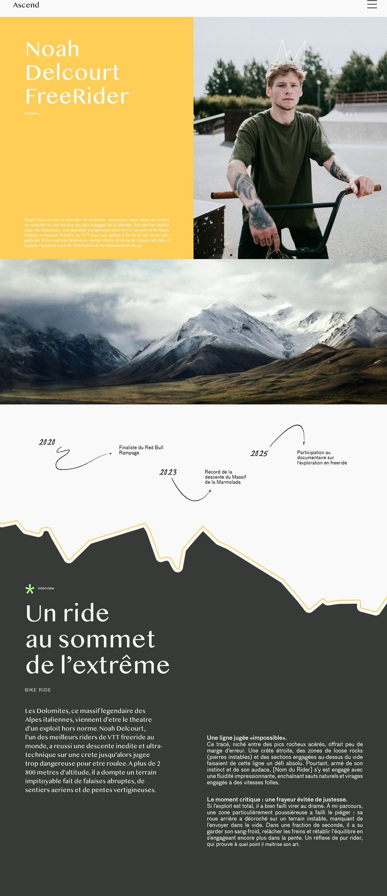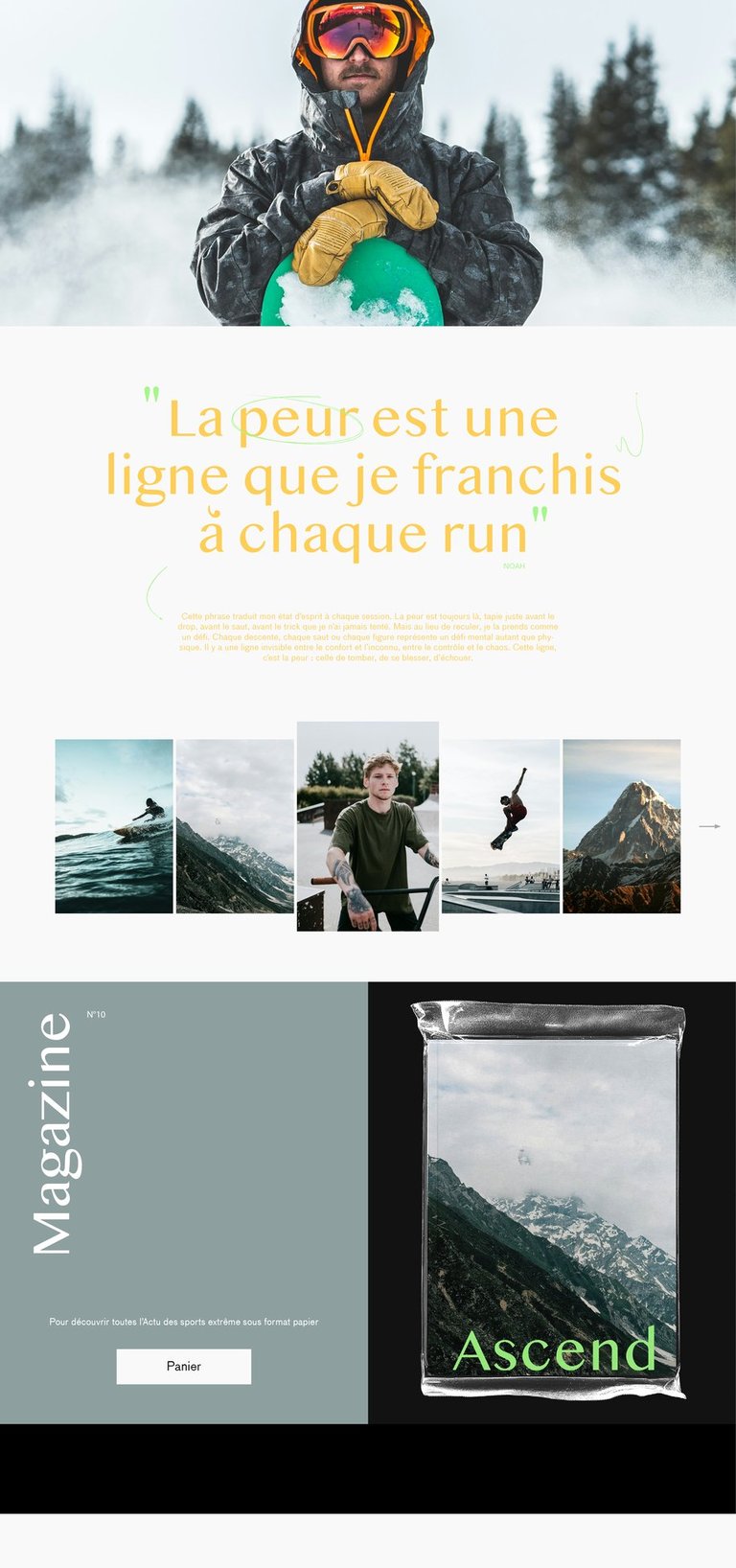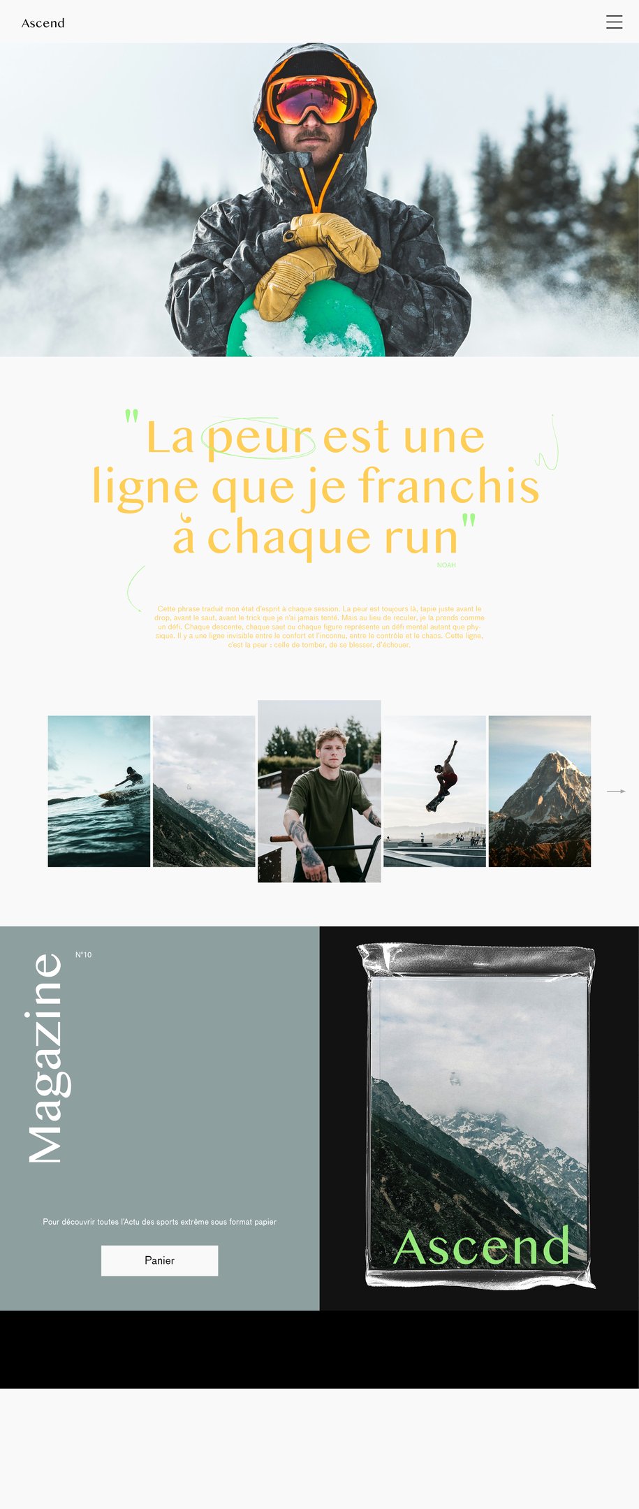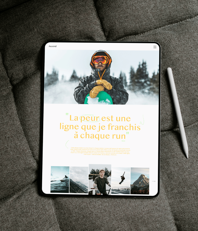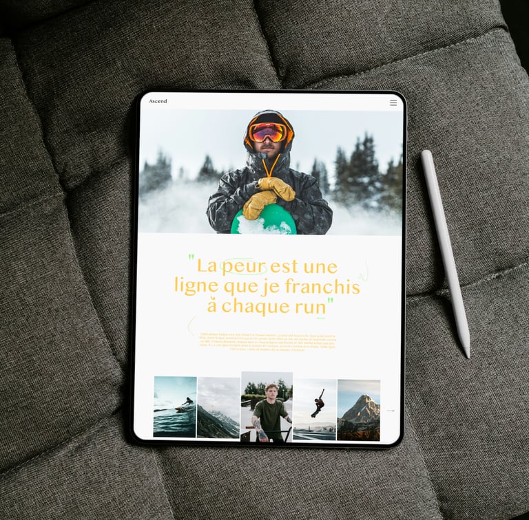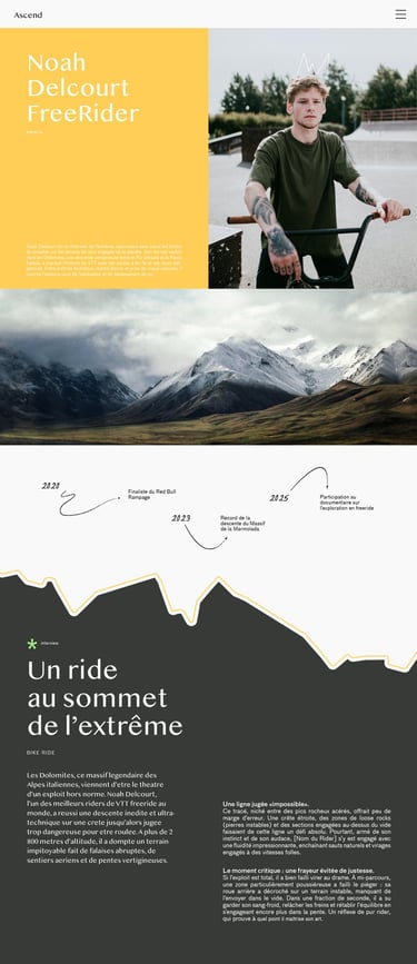 "Ascend" est un magazine semestriel dédié aux sports extrêmes, mettant en lumière les athlètes les plus audacieux et les exploits les plus impressionnants. Chaque numéro célèbre une figure emblématique du monde de l’adrénaline et devient une immersion dans la culture de la performance et du dépassement de soi, où chaque page retranscrit l’intensité, la détermination et la passion de ces sportifs hors normes.
