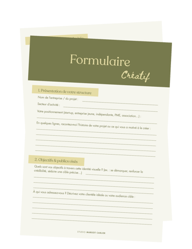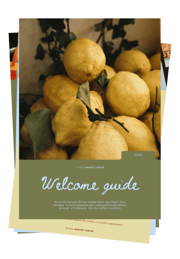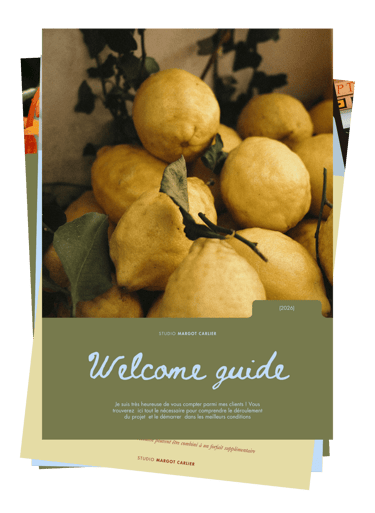 Suite à notre échange, je vous envoie un devis détaillé accompagné d’un "Welcome guide". Ce document vous présente plus en profondeur ma manière de travailler ainsi que les différentes étapes du projet. Un formulaire vous est également proposé afin de recueillir toutes les informations essentielles qui nourriront la création.