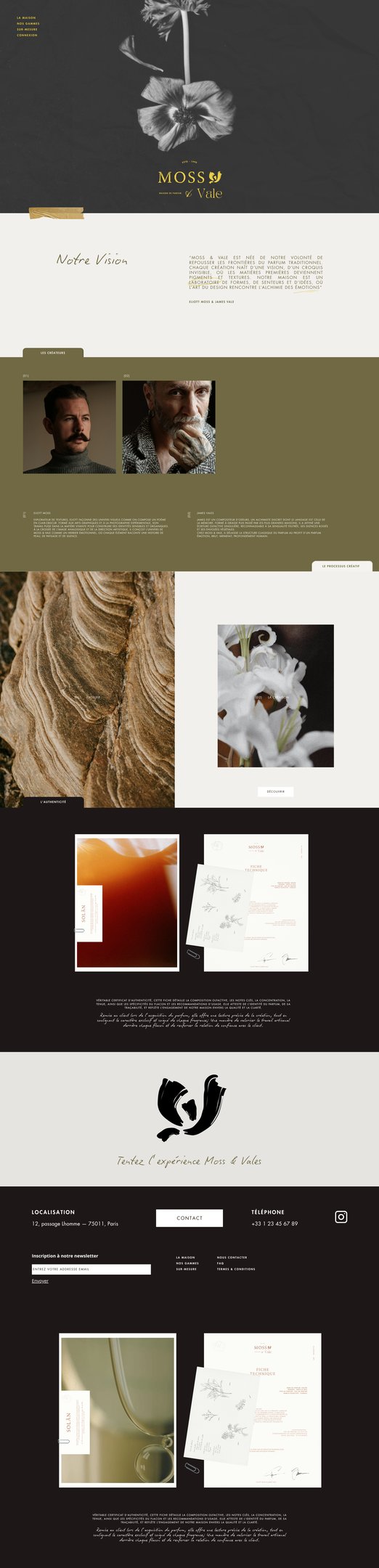 Moss & Vale est une maison de parfums botaniques née à Paris, dans le calme feutré d’un ancien atelier du passage Lhomme. Fondée par Eliott Moose, designer visuel, et James Vale, nez ayant exercé au sein des grandes Maisons, elle explore les liens subtils entre mémoire, paysage et matière. Ensemble, ils composent des fragrances comme on trace des souvenirs : avec lenteur, flou et précision. À travers une identité visuelle organique et poétique, chaque création évoque un lieu intime, une lumière douce, une sensation oubliée, "un parfum qui ne s’impose pas, mais persiste".